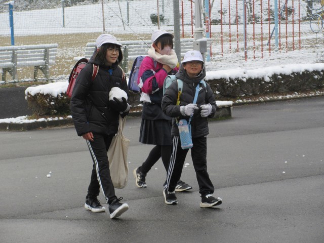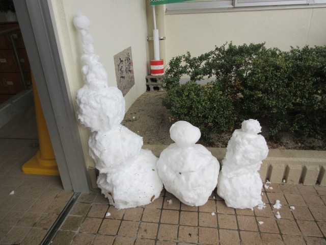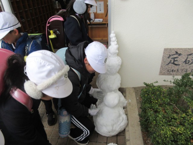 今朝は、今シーズン初めての初雪となりました。登校してくる子ども達の手に、今日はなぜか雪の塊が。大切そうに抱えてやってきました。児童玄関の前には、始めに到着した班から順に、雪を重ねて置いていき、かわいい雪だるま風なオブジェが完成していました。通りかかる先生達も思わず立ち止まり、笑顔に。植木の上のわずかな雪などを集めて、投げ合ったり、丸めたり、子ども達の元気いっぱいの声が響き合っていました。あっという間に溶けた初雪でしたが、子ども達にとってはうれしいプレゼントとなりました。