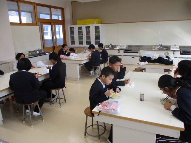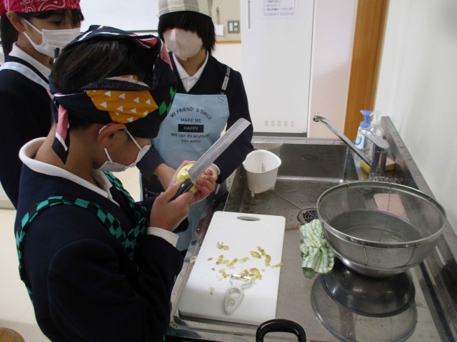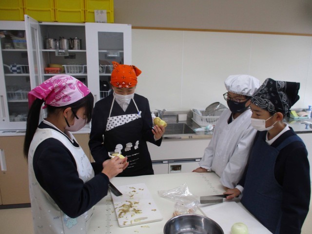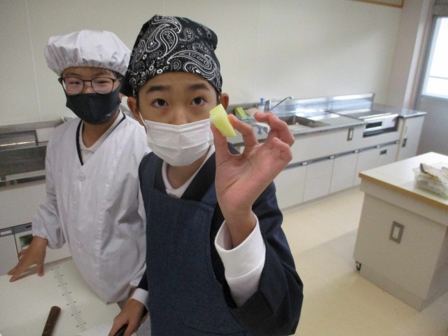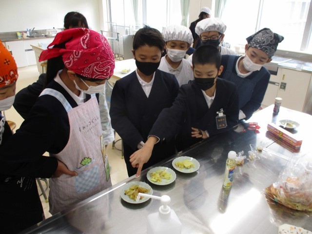 5・6年生は、3・4時間目の家庭科で調理実習をしました。バランスの良い食事の学習の中で「ジャーマンポテト」を調理しました。ジャガイモの皮むきは包丁で挑戦する人もいました。先生からジャガイモのくぼんだところの芽は、きれいに取るように話を聞くと、包丁の角で丁寧に取り除いていました。できあがりを味見で職員室にも持ってきてくれましたが、味付けはグループによって濃いかったり、薄かったり。しかし、どのグループもおいしく出来ていました。お家でも作れるといいですね。