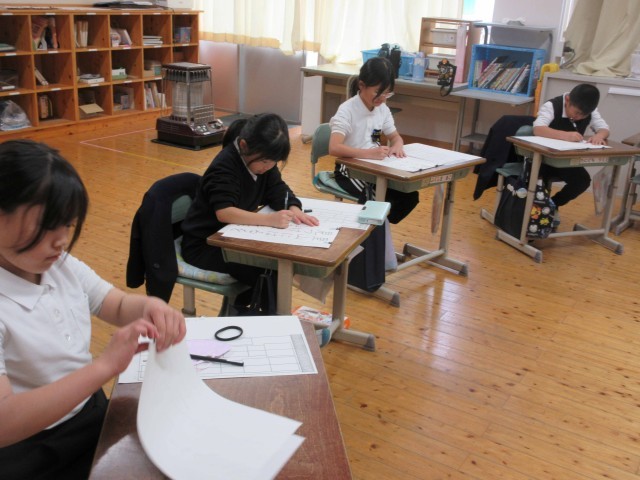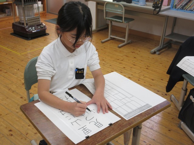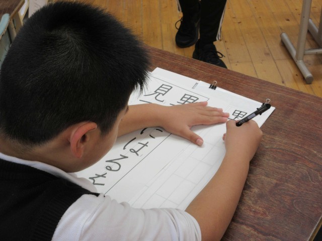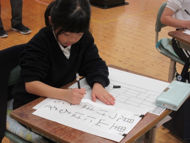 今日の5時間目に、2年生が硬筆での書き初めの練習に取り組みました。今年の課題は「里山にはるを見つけました。」です。初めての書き初めの練習ということもあり、お手本をよく見て、大きい字を書くことを目標に、みんな真剣な様子で書いていました。特に字のバランスが難しく、書き始めると「あ!!」と言う声があちこちで聞こえていました。練習用紙に一文字一文字、ゆっくりと丁寧に集中して書いていました。真剣に練習に取り組む姿はとても立派でした。