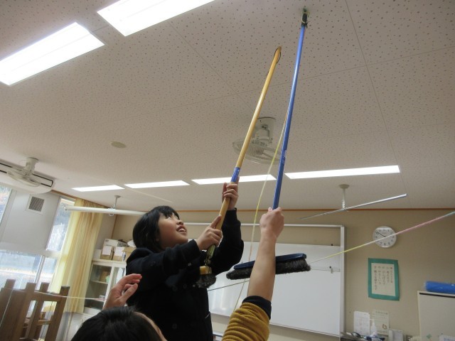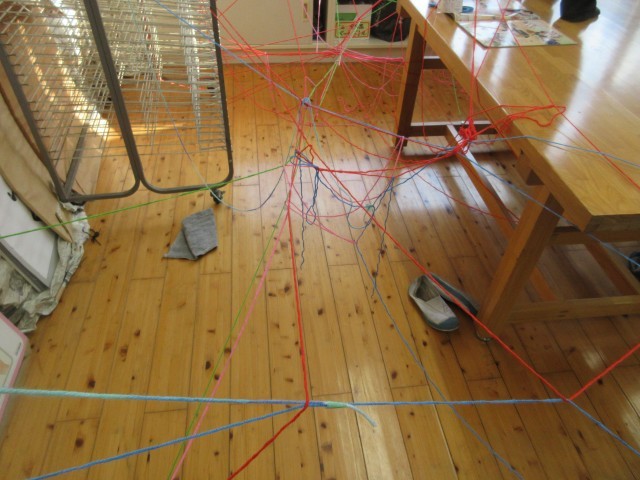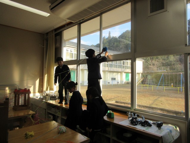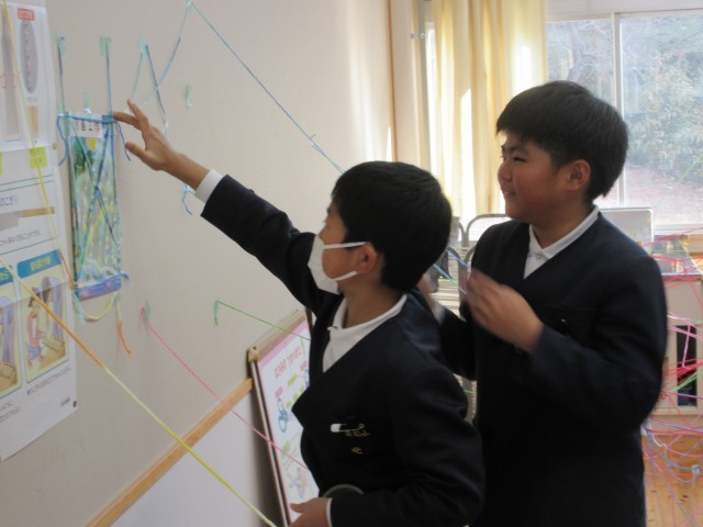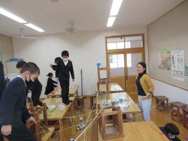 昨日の午後、図工室から楽しそうに活動する声が聞こえてきました。行ってみると、3,4年生がひもをつないで表現する造形活動をしていました。カラフルな毛糸を何本も使ってダイナミックに表現する子どもの表情は、活き活きとしていました。普段は上がれない机の上に上がったり、ほうきを使って天井にひもをつけたり・・・と、想像力を膨らませての創造!はじめは1人や2,3人で作っていたものが、だんだんとつながり、図工室全体がアート空間へと変わっていきました。。