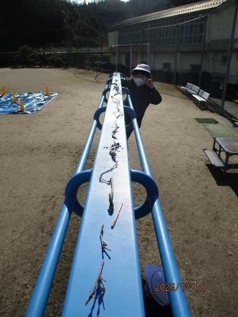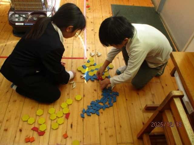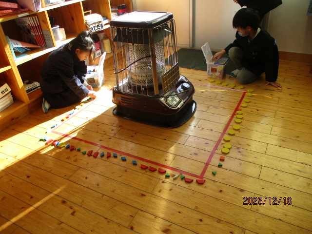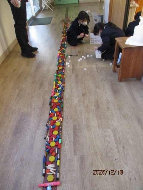 1・2年生は図工で身の回りにあるものを並べて、みんなで協力して作品を作りました。図工室や1・2年教室、ろうかなど教室にあるものをどんどんつなげて、道が出来たり、積み重ねて棟や家になったりして・・楽しみました。外では、ろくぼくの上に木の枝をのせたり、ブランコや滑り台などに葉っぱをのせたりしていました。みんなで協力して一つのものをつくることが、子ども達にとって何よりうれしかったようです。