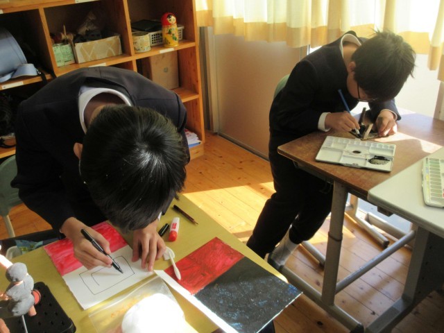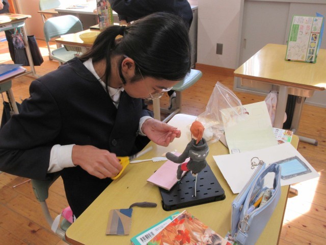5・6年生は、図工の時間に針金で動きの形を作り、そこに紙粘土を肉付けして、自分の将来の夢を表現していました。今日は、色を塗ったり、背景を完成させたり、ニスを塗って仕上げをしたりしていました。どの作品も動きがあり、人間だけでなくていろいろな小物も工夫されていました。みんなの夢があふれている作品に、見ているだけでうれしくなりました。