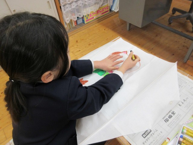 1・2年生が生活科の時間に「たこ作り」に挑戦しました。真っ白なたこをキャンバスにして、思い思いの絵を描いていきます。お正月らしく、今年の干支である「午(うま)」や雄大な「富士山」を描く子が多く見られました。描きたいものが次から次へとあふれてくるようで、小さなたくさんのイラストで画面をいっぱいにしている人が多く、みんな夢中で描いていました。あいにく今日は運動場のコンディションが悪く、ぬかるんでいたため、あげるのはお預けとなりました。たこを空高く上げる日が今から待ち遠しいね。