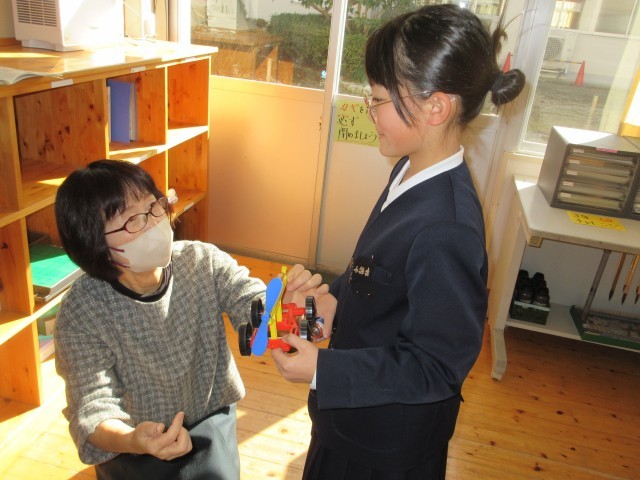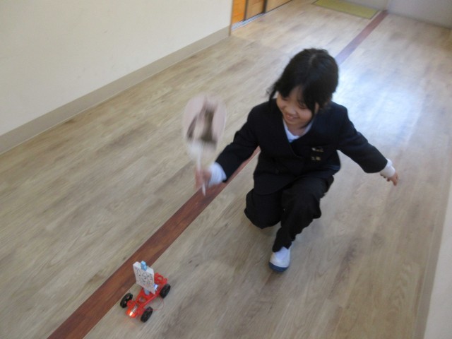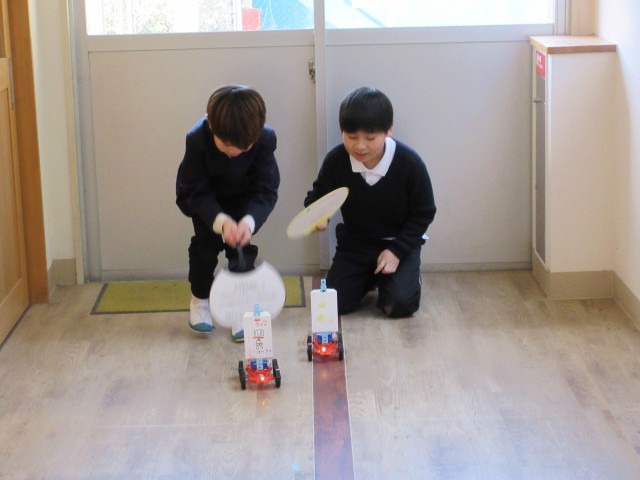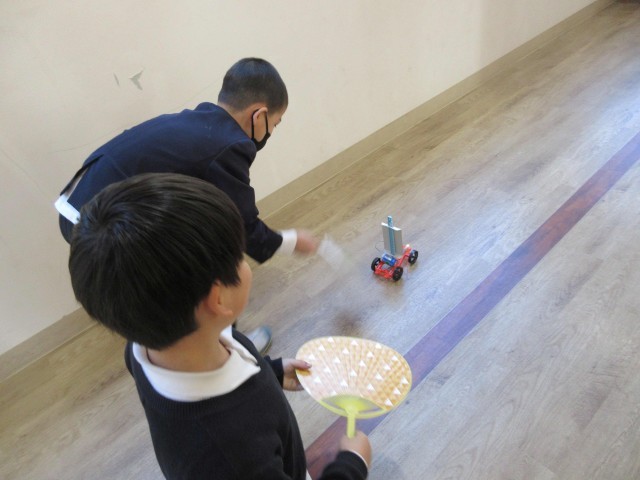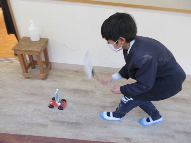 3年生が理科の学習で、単一電池を使って、どうやったら豆電球に明かりがつくかチャレンジしていました。電球に明かりがともったら、以前作っていた風とゴムで動く車に取り付けて、明かりをともしながら走らせたいと、廊下でうれしそうに試していました。多目的教室から校長室までの長い廊下を、明かりのともった車が行ったり来たり。3年生の笑顔が印象的でした!
