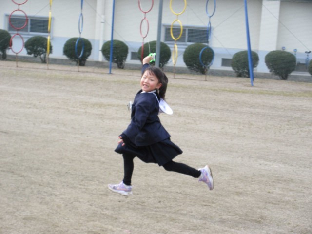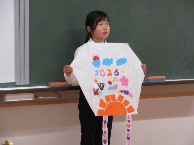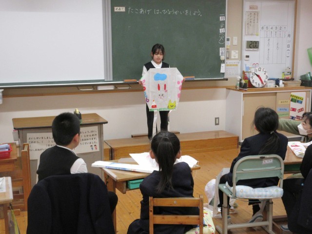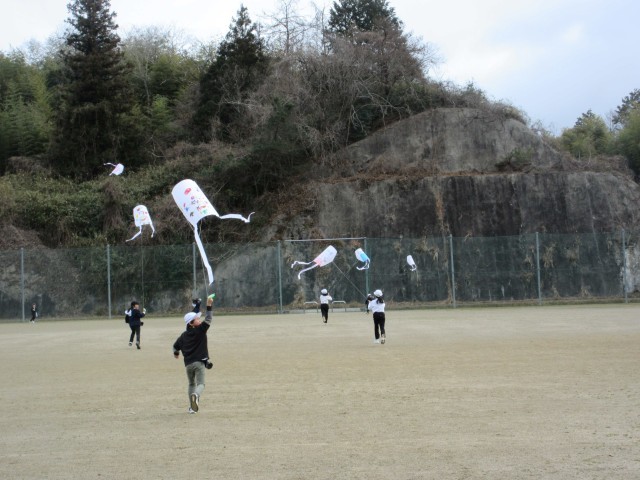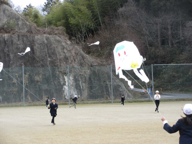 1・2年生は、3時間目の生活で、作った自分のたこを紹介してから、運動場でたこあげをしました。風が少し吹いていて、上手のたこを風に乗せると高くあがっていましたが、ほとんどは勢いよく自分の力で走ってあげていました。寒いのでちょうどいい運動になり、ほっぺたを真っ赤にしながら、「暑い!」といって走っていました。下に落ちては、何度も何度も挑戦してたこあげをしていました。あがったたこも素敵ですが、うれしそうに笑顔で走る姿が最高でした!!