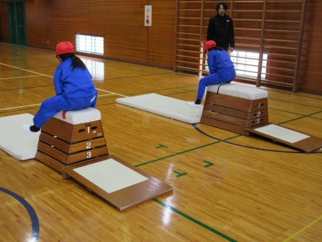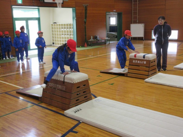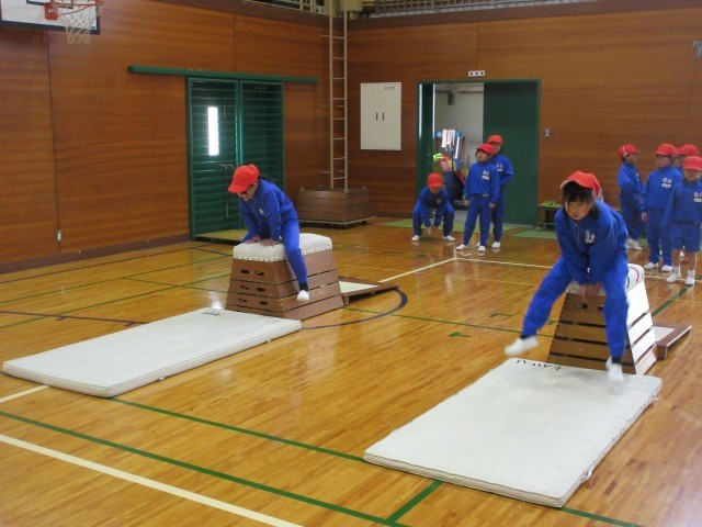 跳び箱にチャレンジ!! 公開日 2026/01/28 更新日 2026/01/28 児童の様子 1月28日(水) 今日の3時間目、1・2年生が体育館で体育をしていました。はじめに「へんしんジャンケン」をして、楽しみながら体をほぐしていました。その後は、跳び箱をみんなで協力して用意して、今日は「またぎおり」にチャレンジ!しっかり踏み切って、いったん跳び箱にまたいで座ります。それから、手を前にずらしておりる練習です。少しずつレベルアップしていきます!! +3
