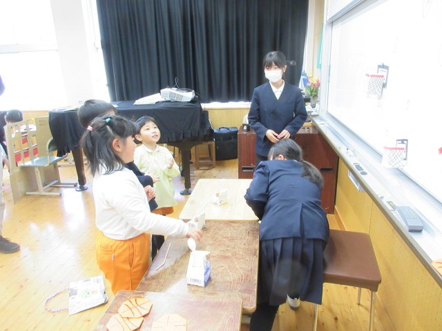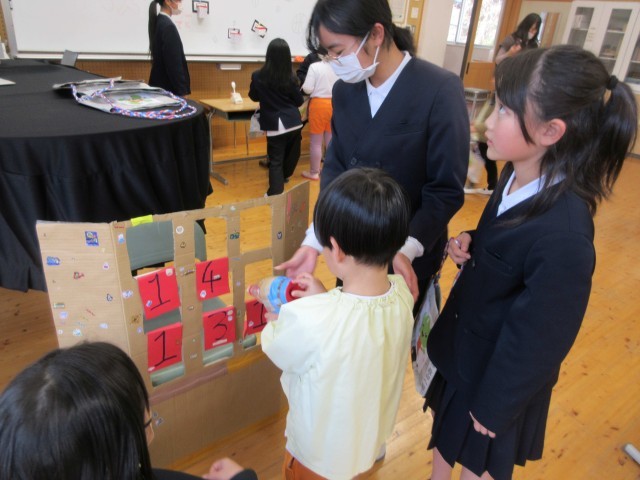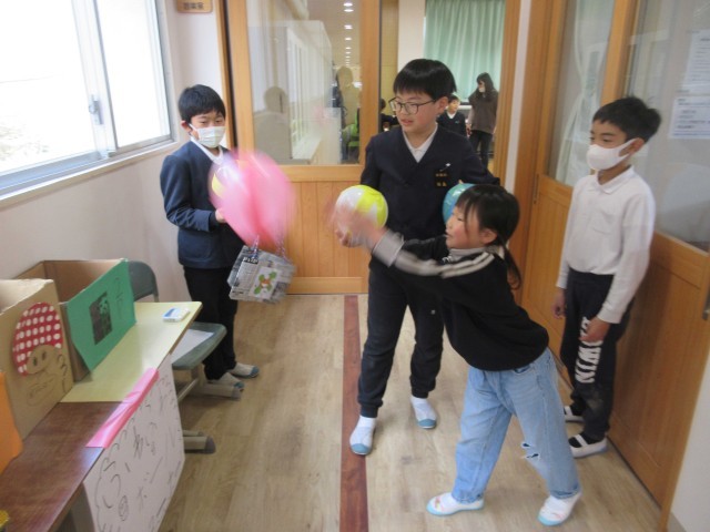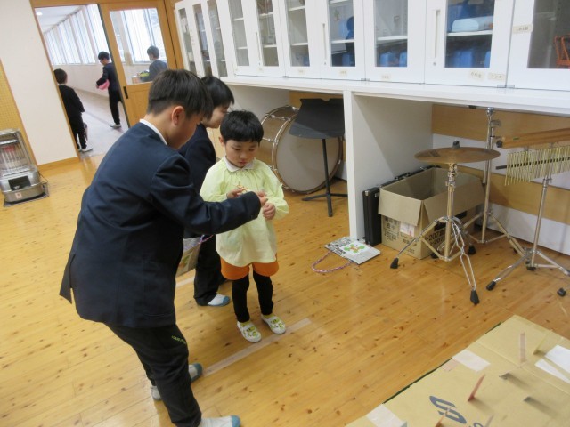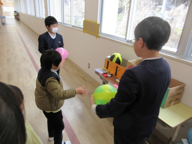 今日は、来年度入学の5名のお友達が、小学校へお家の人と一緒に、体験入学にやってきました。5時間目は、1年生の教室で1年生の隣に座り、国語や算数の勉強をしているのを見たり、名前を書いたりしました。1時間上手の座って、みんなとても立派でした。お家の人が説明を聞いている間は、3~5年生のお兄さんお姉さんと一緒に、音楽室で過ごしました。「まとあて」や「バスケ」「風船入れ」「割り箸でっぽうのまとあて」など楽しいゲームやプレゼントを用意してくれていました。夢中になって遊んでいたら、あっという間に時間がきていました。「すごい。」「上手。」「がんばれ。」とほめる言葉がたくさん飛び交っていました。4月が待ち遠しいですね。