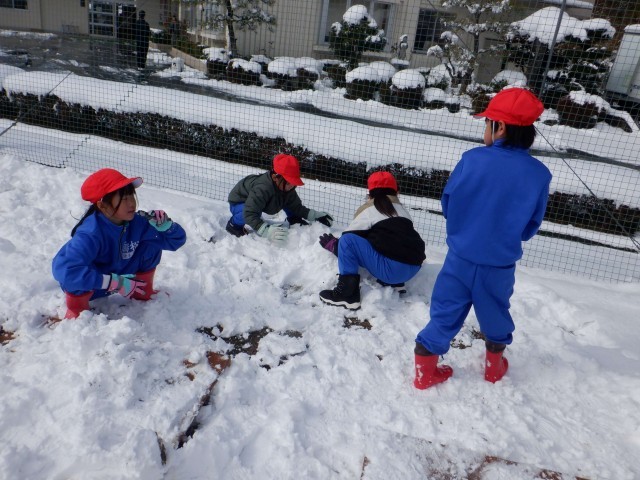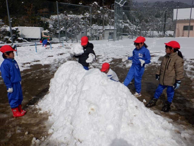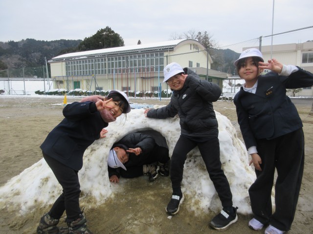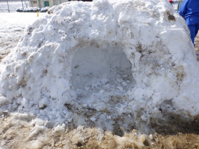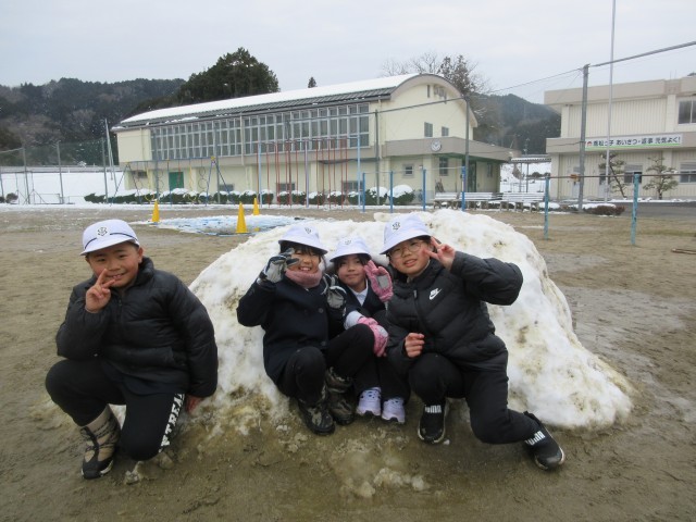 1・2年生が昨日の体育で、校庭に積もった雪を集めてかまくらを作りました!!1人は入れる大きさで、中に入って楽しみました。今日も、まだ溶けていない校庭の端の雪で,休み時間は雪合戦をして遊んでいました。かまくらもまだ溶けずに残っていました。道路などは、1日できれいに溶けてしまいましたが、喬松小学校の周りは、もう少し雪遊びが出来そうです。子ども達にはうれしい雪となりました!