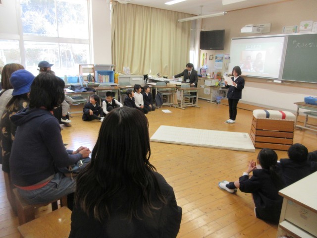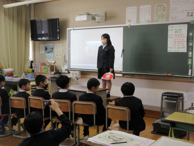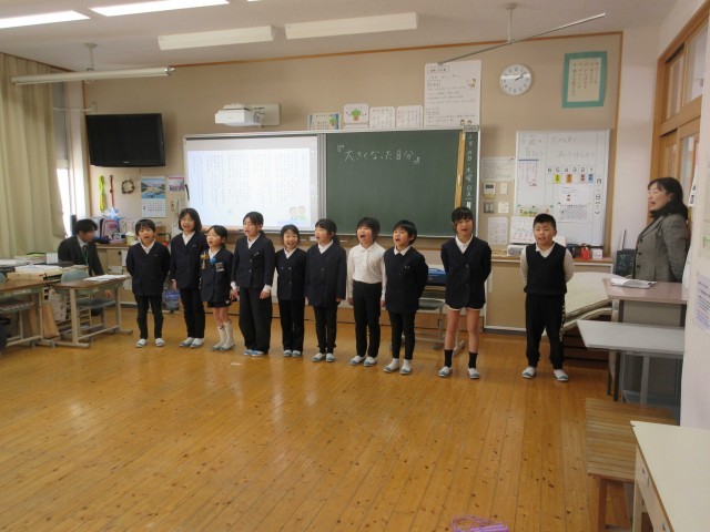 今日は、今年度最後の参観日でした。1・2年生は「大きくなったわたし」で生まれたときのことや名前に込められた願い、小さかったときの思い出、小学生になって出来るようになったことなどを写真と共に振り返り、発表しました。なわとびや前回りなど実際に見せてくれました。「ビリーブ」の歌声も素敵でした。3・4年生は、国語の学習で「道具の移り変わり」を自分たちでテーマを決めて調べ、発表しました。鉛筆やカメラ、アイロンのグループがあり、昔から現代にどう変わってきたかをわかりやすく発表していました。最後発表が終わった残りの時間は、お家の人に言いたい「未成年の主張」があり、大爆笑でした。5・6年生は、今までの小学校の思い出をスライドにして、一人ひとり発表しました。修学旅行や山の学習、入学式のことなど懐かしい楽しかった思い出を振り返りました。お家の人への感謝のメッセージも最後に言葉にして伝えました。どの学年も1年間の成長を見ていただけた参観日でした。お忙しい中、ありがとうございました。