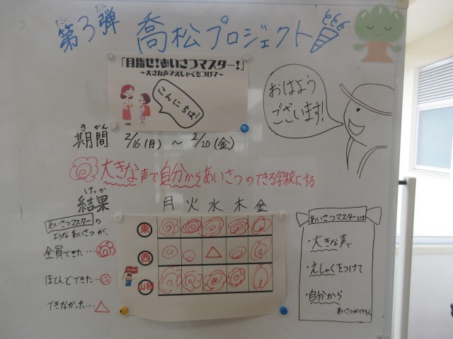 先週、「あいさつ」の喬松プロジェクトがあり、自分から大きな声であいさつをしようと3~6年生が取り組んでくれていました。週の終わりに近づくにつれ、どんどんあいさつの声が良くなってきていて、とってもうれしかった先週。3連休明けて、プロジェクトは終わったけれど、みんなのあいさつはどうかなと思っていたら、気持ちの良いあいさつは続いていました。そして、ピカイチのあいさつ名人達もやはり素晴らしいあいさつでした!朝から心が温まる素敵なスタートとなりました。(給食の終わりの時間にあいさつ名人達をカメラでパチリ!)
