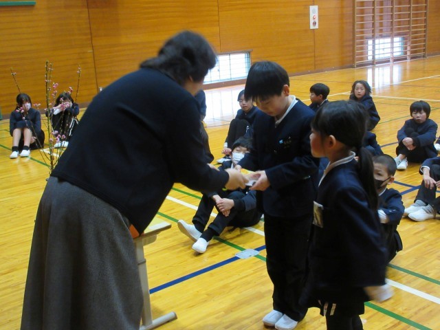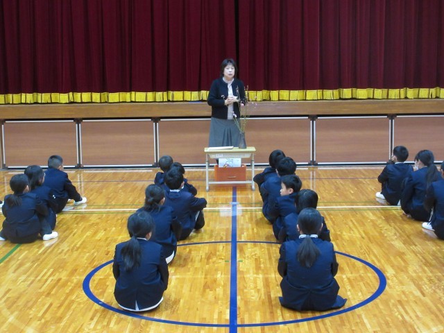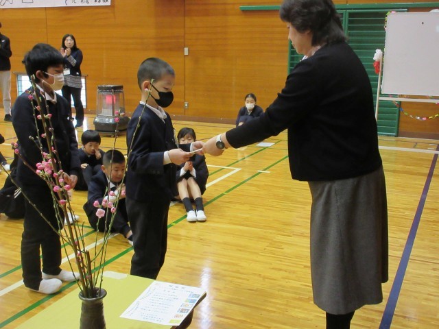 弥生3月、春の訪れを感じる季節となりました。朝礼のはじめには、かわいらしいピンクの桃の花を見せながら、「桃の節句」の話をしました。それから、2月に取り組んでいた「喬松プロジェクト」の振り返りをし、特に続けて頑張っているあいさつについて話しました。あいさつ名人達が更なるレベルアップする中、下校の時も地域の方からあいさつをほめられたお友達にみんなで拍手を送りました。そして、授業中に気持ちの良い返事や「ありがとうございます」がピカイチの3年生についても紹介しました。最後は、チャレンジ読書の学年賞表彰と1700冊から1900冊のビンゴ賞、ニアピン賞を表彰しました。学年終わりまであと少し。一日一日を大切に過ごしてほしいです。