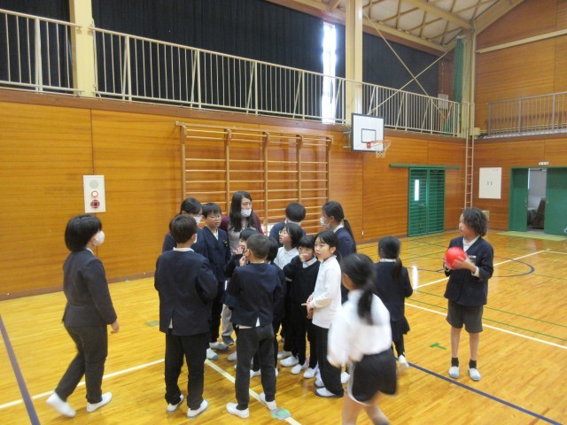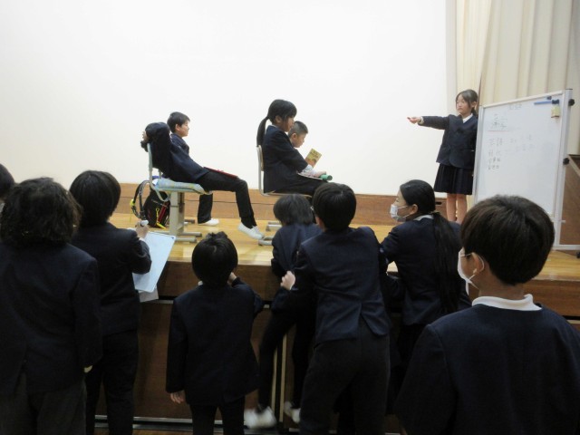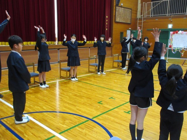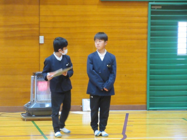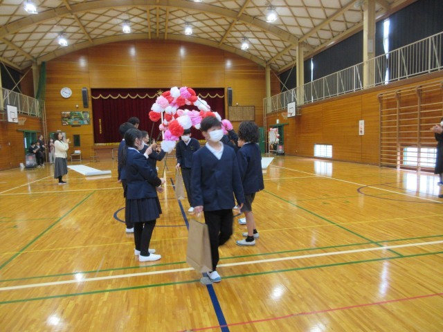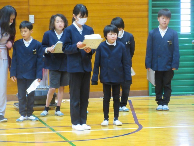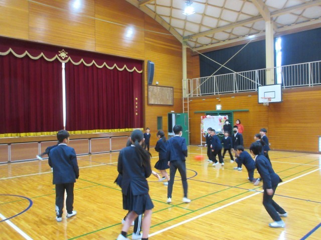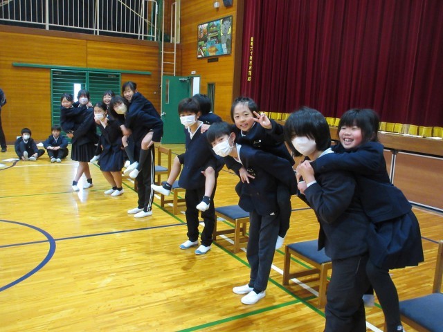 今日は6年生を送る会がありました。4・5年生を中心に計画・準備をし、2・3年生は遊びを一つ考えてくれました。自分の役割をてきぱき動いて、時間通りに進めている4・5年生に感心しました。2・3年生も「まちがい探し」の遊びをステージを使って行ってくれました。縦割り班ごとに集まり、誰の何が変化しているかを見つけてもらうゲームでした。2・3年生は、幕が閉まるまで、まるで写真のようにじっと動かずに上手に演技していました。ステージにかぶりつきで、みんな必死にまちがいを探していました。1年生は手作りプレゼントを作って渡し、最後に6年生に全員おんぶをしてもらいました。「やったあ。」と大喜びでした!二つ目の遊びは、王様ドッジで赤白対決をしました。それから、恒例の「6年生くどき」で、4・5年生が6年生一人ひとりの素敵なところをリズムよく発表してくれました。6年生との楽しい思い出が増えた、ほのぼのした素敵な会となりました。