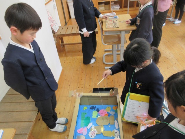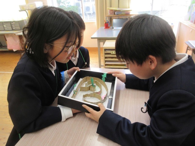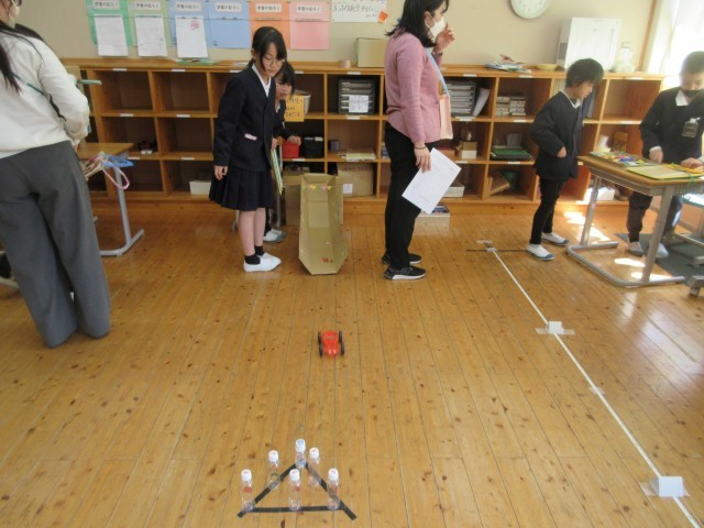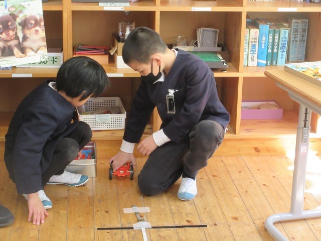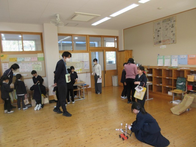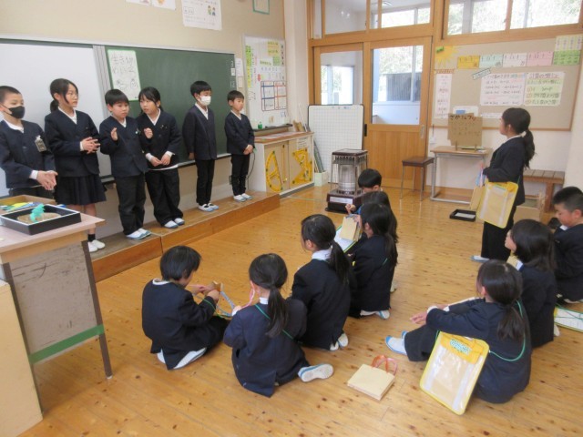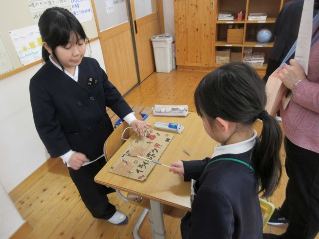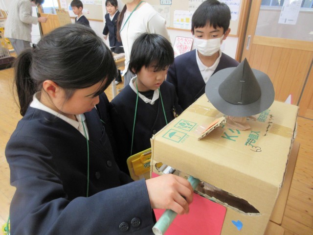 4時間目に、3年生が「おもちゃランドをひらこう!!」と1・2年生を招待してくれました。今まで理科の学習で習ったことを使って、自分達でやりたいことを設計図に書いて考え、用意をしてくれていました。磁石、電気、ゴムを使った6人がそれぞれ違うおもちゃで、アイデアにあふれていました。1・2年生がやってくると、自分のおもちゃの遊び方を丁寧に優しく教えてくれていました。遊んだ後は景品もあり、1・2年生はうれしそうに選んでいました。おもちゃはもちろん、態度もとても立派な3年生に感心しました。最後に振り返りで、2年生からは、「来年、わたしたちもやりたい。」と感想がでていました。1・2年生があこがれる3年生の姿でした!
