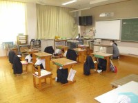 まず高学年が、肢体の不自由な方のくらしについて学習しました。津山市社会福祉協議会の職員の方2名と、現在久米地区にお住まいの車いすで生活していらっしゃる方1名をお招きして、お話を聞いたり車いすで移動させてもらったりしました。