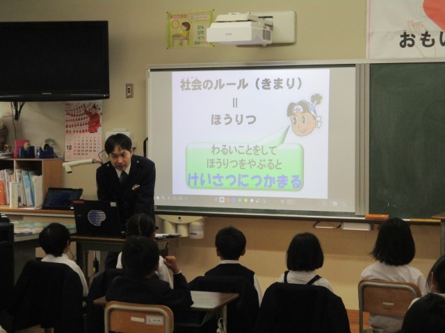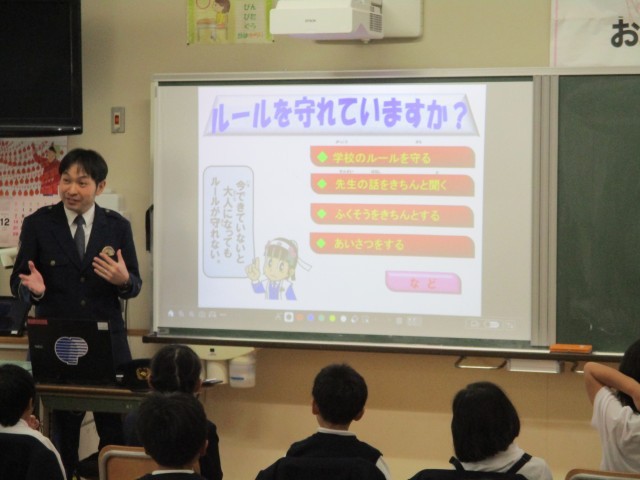 12月3日(水)、1・2年生を対象に「非行防止教室」を実施しました。今回は、岡山県警および津山少年サポートセンターより警察官の方を講師にお迎えし、社会のルールを守ることの大切さについてお話しいただきました。教室のテーマは「どこがわるいの?」。