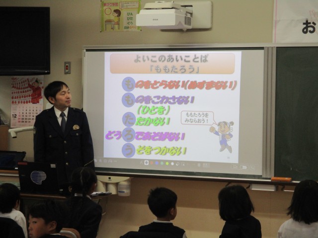 スライドや具体的な事例を交えながら、「してよいこと」と「してはいけないこと」について、低学年の子どもたちにも分かりやすく説明していただきました。特に印象的だったのは、みんながルールを守って安全に暮らすための「よいこのあいことば『ももたろう』」です。