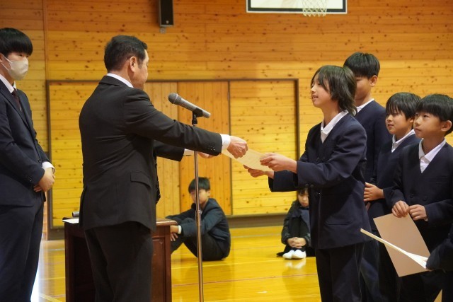 12月24日、例年になく穏やかで暖かいクリスマスイブの朝を迎えました。本日、本校では第2学期の終業式を執り行いました。登校してきた子どもたちの表情は、明日からの冬休みを楽しみにするような朗らかなものでしたが、式が始まると一変。体育館に整列したその姿は非常に「凜」としており、この2学期で培った心の成長が、その立ち振る舞いから真っ直ぐに伝わってきました。今学期を振り返れば、運動会や校外学習といった大きな行事から、日々の授業や係活動まで、枚挙にいとまがありません。それぞれの場面で、子どもたちが悩み、考え、協力して頑張った姿が鮮明に思い浮かびます。式の中で話を聞く真剣な眼差しに、確かな手応えを感じる締めくくりとなりました。また、終業式の後には「持久走」の表彰式も行われました。 低・中・高学年ごとに、素晴らしいタイムで1位に輝いた児童が紹介され、全校児童・教職員から温かい拍手が送られました。惜しくも入賞を逃した子も、自分自身の限界に挑んだ経験は大きな財産となったはずです。保護者の皆様、地域の皆様、今学期も本校の教育活動へのご理解とご協力をいただき、誠にありがとうございました。 どうぞ、健康に気をつけて、良いお年をお迎えください。
