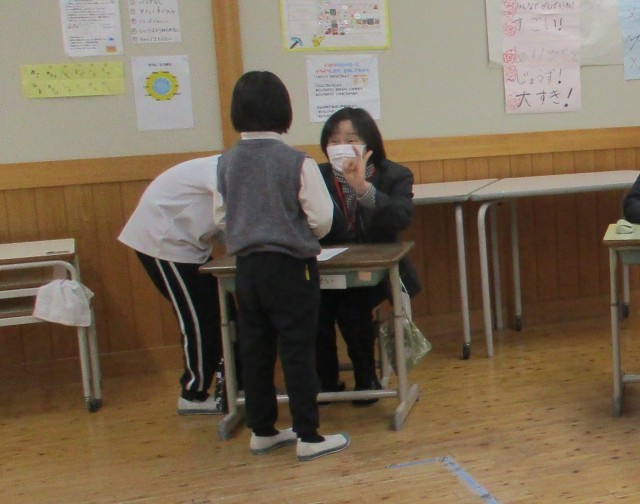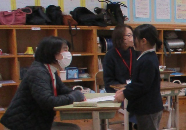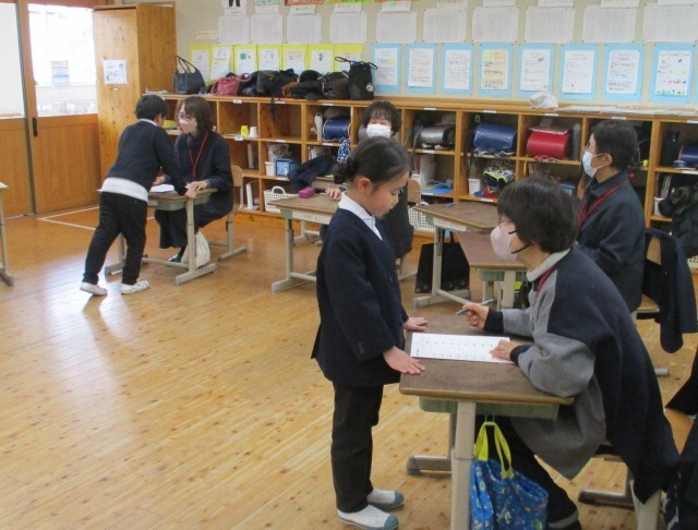 1月23日(金)、2年生の算数の学習に、学校支援ボランティアの皆様が来てくださいました。今日のめあては「九九の習熟」です。子どもたちは、これまで一生懸命に練習して覚えた九九を、ボランティアの方々に一人ずつ聞いてもらいました。前から順番に唱える「上り」だけでなく、後ろから唱える「下り」にも挑戦!緊張した表情でスタートする子もいましたが、ボランティアさんの優しい笑顔に見守られ、一言ずつ丁寧に進めていきました。無事に最後まで唱え終わり、カードに合格シールを貼ってもらうと、どの子もパッと顔を輝かせ、とてもうれしそうな表情を見せてくれました。ご協力いただいたボランティアの皆様、温かい励ましをありがとうございました。