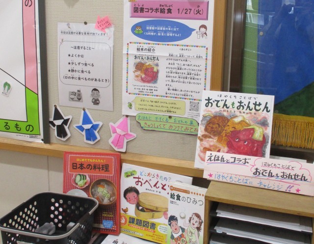 今週は「学校給食週間」です。1月27日(火)2日目の今日のテーマは「図書コラボ給食」です。子どもたちに人気の絵本『おでんもおんせん』です。この絵本は、おでんの具材たちが温泉に浸かって、楽しい早口ことばを繰り広げる物語です。物語に登場する料理を実際に味わうことで、読書と食育の両方に親しみを持ってほしいという願いを込めて作られました。本日の献立