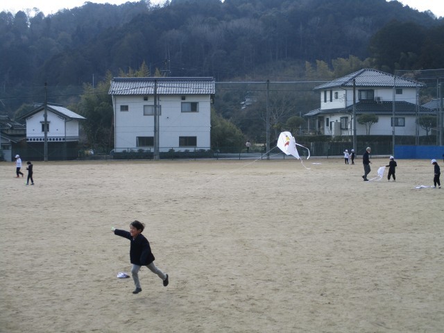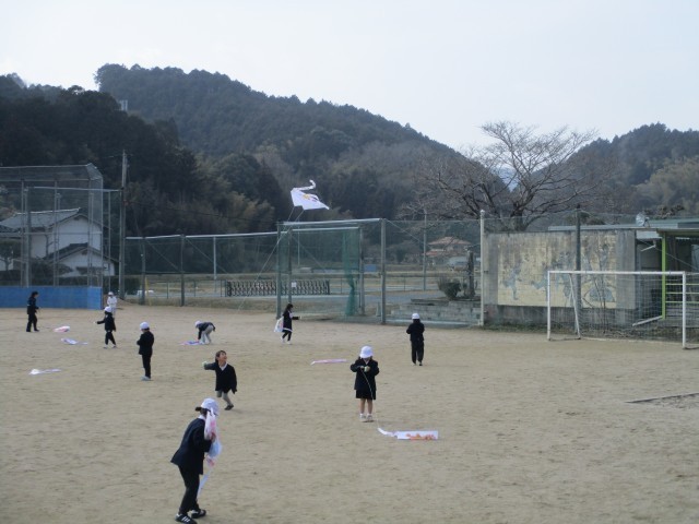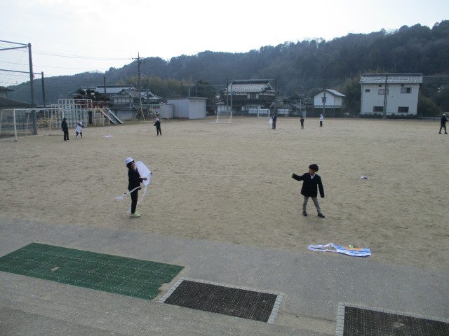 2月6日(金)の5時間目、生活科の学習で1・2年生が「たこあげ」に挑戦しました。この日は冷たい北風が吹く寒い午後でしたが、子どもたちは元気いっぱい!運動場を力いっぱい駆け回りました。最初はなかなか上手く揚がらなかったたこも、風を捕まえるコツを掴むと、だんだんと高く舞い上がるように。「あんなに高くあがったよ!」「見て見て!」と、運動場には子どもたちの歓声が響き渡りました。 夢中になって走り回るうちに、体も心もぽかぽかに。寒さもすっかり忘れ、みんな楽しそうな笑顔でいっぱいの一時となりました。