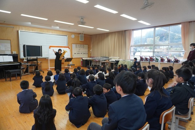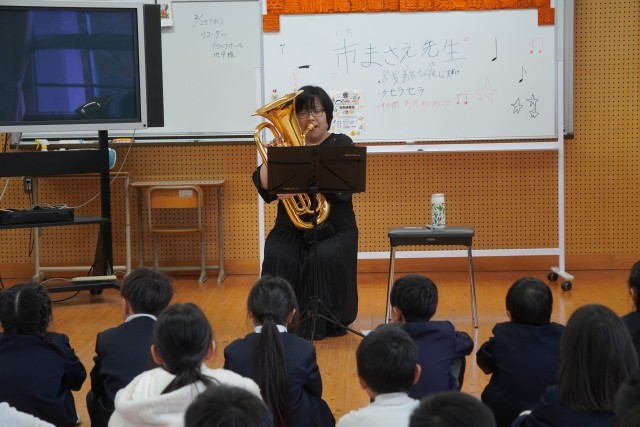 2月25日(水)の2時間目、音楽室にて全校児童を対象としたユーフォニアム演奏会を開催しました。今回は、ユーフォニアム奏者である 市 将江さんをお迎えし、間近で本物の演奏に触れる貴重なひとときを過ごしました。