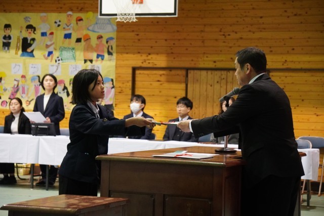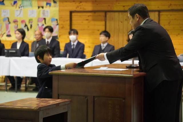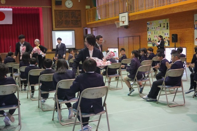 3月25日(水)、少し肌寒さを残す朝。卒業した6年生のいない教室は静まり返り、どこか寂しさを物語っているようでした。しかし、登校してきた下級生たちは、いつものように運動場を駆け回ります。その屈託のない笑顔の中にも、年度末特有の「お別れ」を感じ取っているような、少し大人びた表情が混じっていました。修了式。1年前、まだ幼さの残っていた子どもたちが、今では見違えるほど凛々しく、引き締まった背中で整列しています。3人の児童による作文発表では、自分と向き合い、一歩ずつ進んできた「努力の足跡」が真っ直ぐな言葉で語られ、会場は温かな感動に包まれました。続く退任式では、5名の先生方との別れを惜しみました。共に笑い、共に悩み、心を通わせたかけがえのない時間。共有した全てが、子どもたちの血肉となる大切な宝物です。感謝の涙と共に手渡された花束は、新しい季節へのエールでもあります。この1年、本校を支えてくださった皆様に深く感謝いたします。別れの寂しさを乗り越え、子どもたちは次なる学年への期待を胸に、力強く歩み出します。