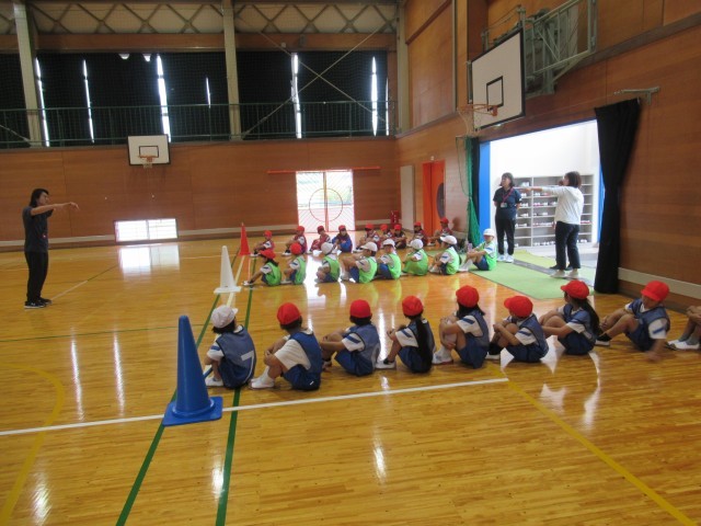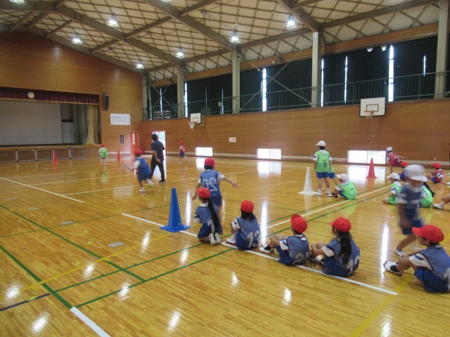 今日は、1・2年生が「折り返しリレー」の練習をしていました。あいにくのお天気でしたので、体育館で走っていました。