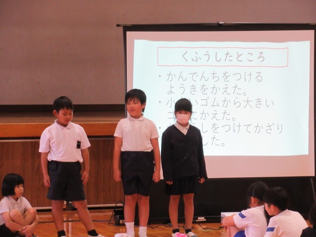 説明文は、短く、すっきりとした内容でまとめていました。作るときに工夫した点も紹介していました。みんな、少し緊張しながら発表していました。