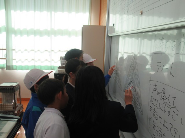 音楽室では、2グループに分かれ、黒板に大きな三角形をかき、線に接しないよう、中に中に三角形を書いていっていました。多くかけた方が勝ちです。