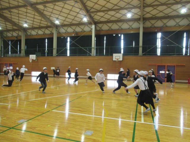 天候の関係で、体育館で実施しました。6年生が鬼となり、走り回る合間を、下級生が逃げ続けます。