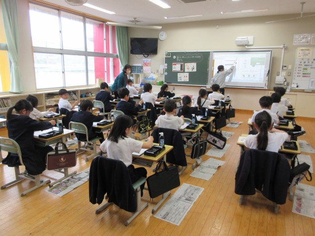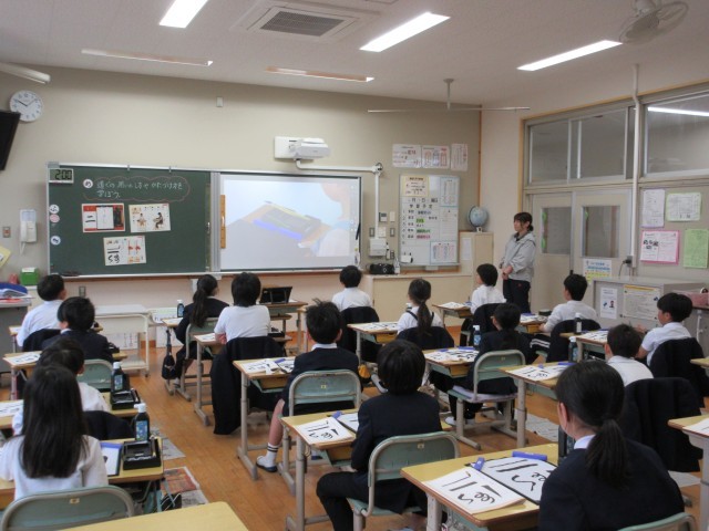 3年生から始める勉強は、リコーダー、習字、理科、社会などたくさんあります。今日は、習字(毛筆)の初めての授業でした。道具の名前、机の上への置き方、筆での書き方、片づけ方と教わることも盛りだくさんですが、みんな、先生のお話をよく聞いて最後の片づけまでがんばりました。