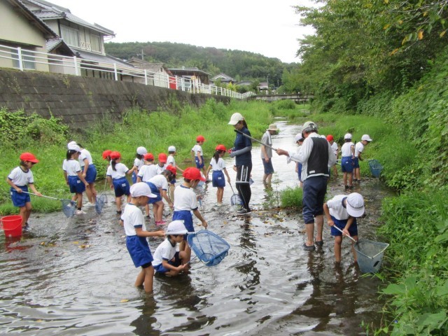 生活科の学習で、1.2年生が合同で川遊びをしました。3名の地域の方をゲストティーチャー(先生)としてお招きして、学校の近くを流れている倭文川で行いました。