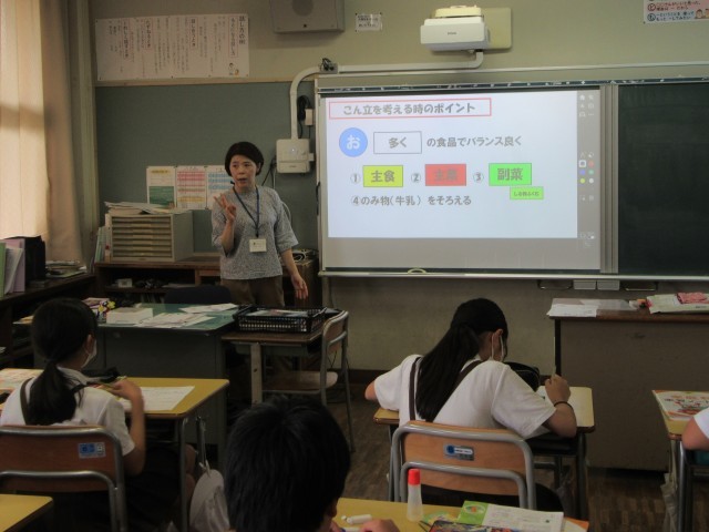 6年生が、津山西中学校の栄養教諭の春名先生をお迎えして、家庭科の学習で食育指導を行いました。