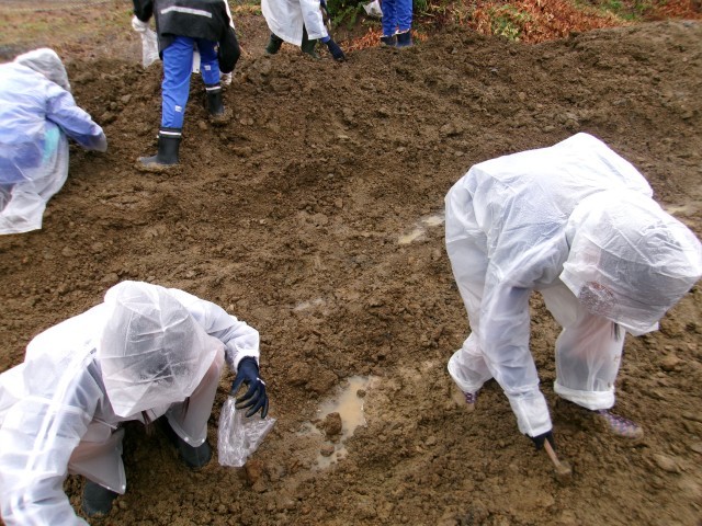 子どもたちは雨の寒さを忘れるほど夢中になり、石を叩き、削りながら太古のロマンを探しました。