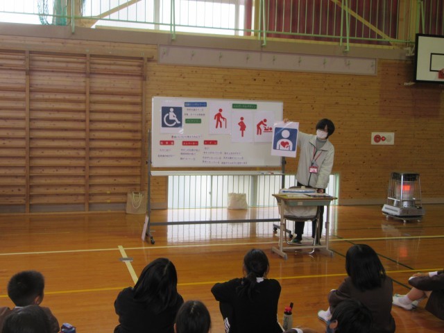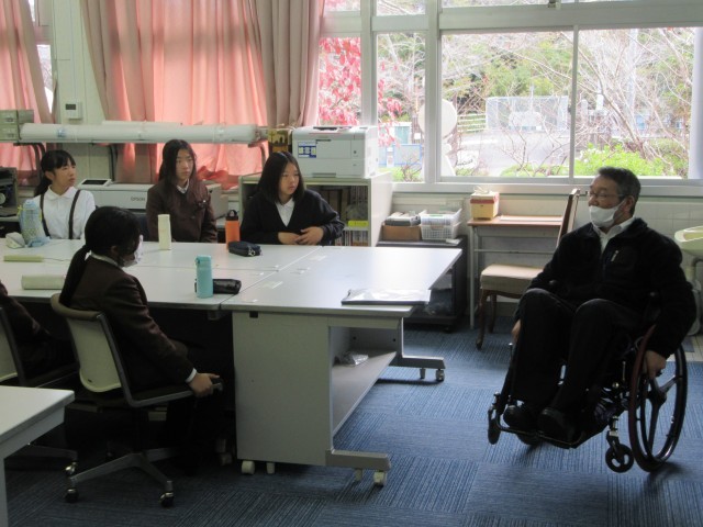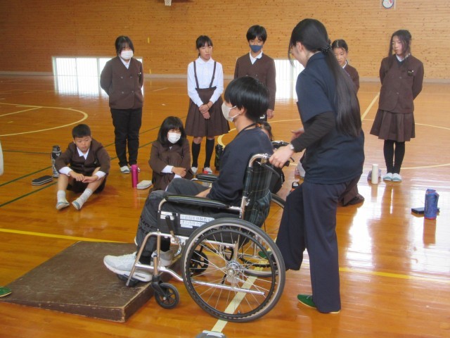 社会福祉協議会の森岡さん、岡崎さん、車いすを利用されている高橋さんをゲストティーチャーにお招きし、福祉教育の一環として車いす体験学習を行いました。