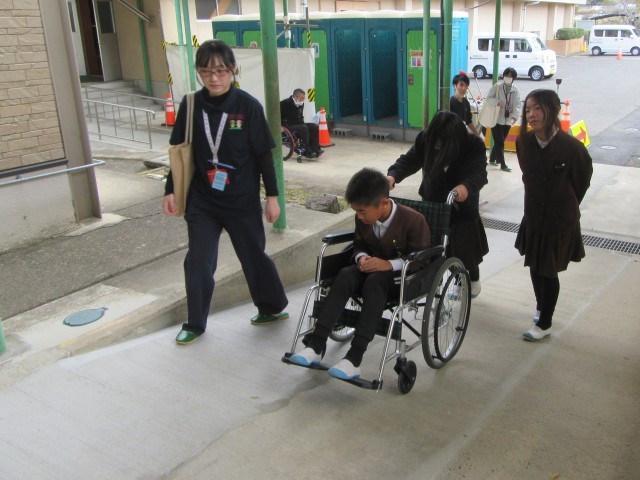 体育館周りやろう下など、校内の様々な場所を移動する中で、子どもたちは小さな段差や傾斜のある場所で介助することの難しさを実感しました。