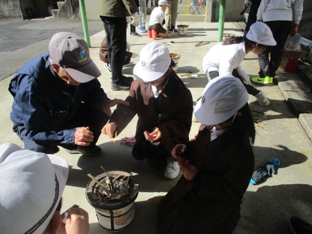 初めての作業に緊張しながらも、先生に教えていただきながら、少しずつ火が大きくなる様子に子ども達は目を輝かせていました。