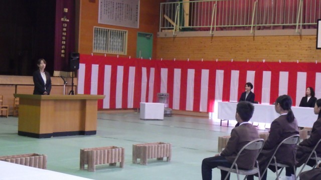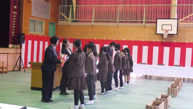 その後、今年度末で異動・退職される先生方をお迎えし、体育館で退任式を行いました。