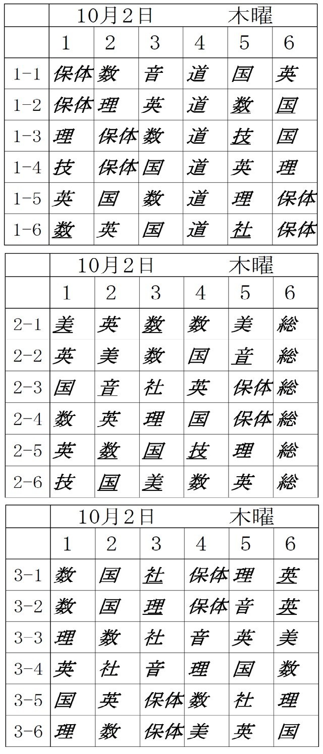 50分×6校時、給食あり、掃除なし、部活動あり、帰りの会終了15:30(3年15:40)、生徒下校完了17:30(最大)です。