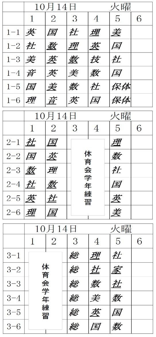 この日はノー部活動デーで、部活はありません。その代わりに放課後、専門委員会や体育会のブロックの打ち合わせがあります。また体育会の学年練習も入っています。体操服はもちろんのこと、水分や汗ふきタオルなども忘れないようにしましょう。
