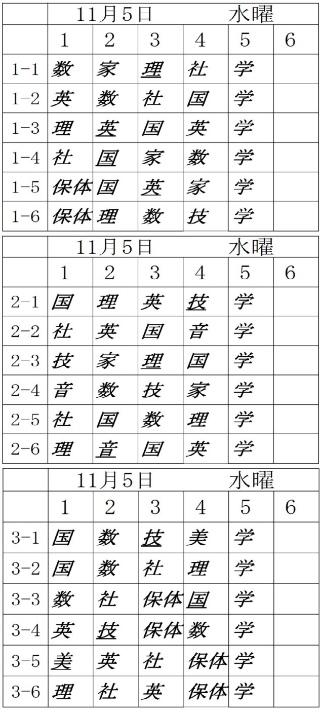 さて明日11月5日(水)の時間割です。