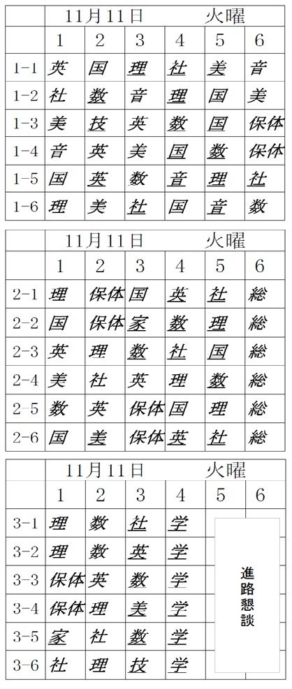 さて明日11月11日(火)の時間割です。明日も3年生は午後三者懇談があるため、別日程となります。