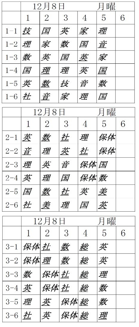 50分×5校時、給食あり、掃除あり、部活動なし、帰りの会終了14:45(3年14:55)、生徒下校完了15:05(3年15:15)です。ノー部活動デーとなり、部活動はありません。
