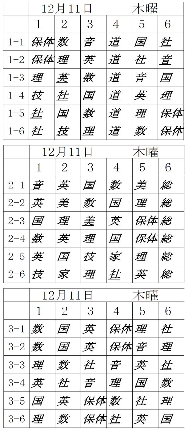 さて明日12月11日(木)の時間割です。