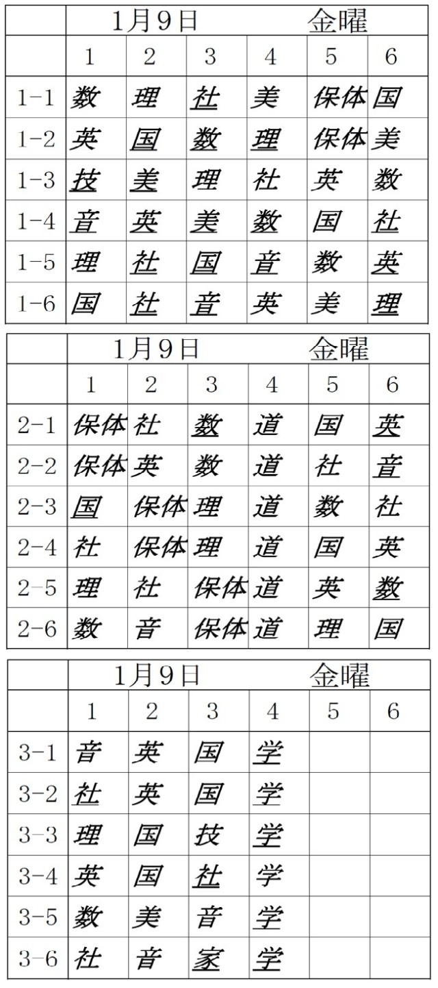 さて明日1月9日(金)の時間割です。明日は3年生は進路事務作業の関係で、1・2年生とは別時程となりますので注意してください。