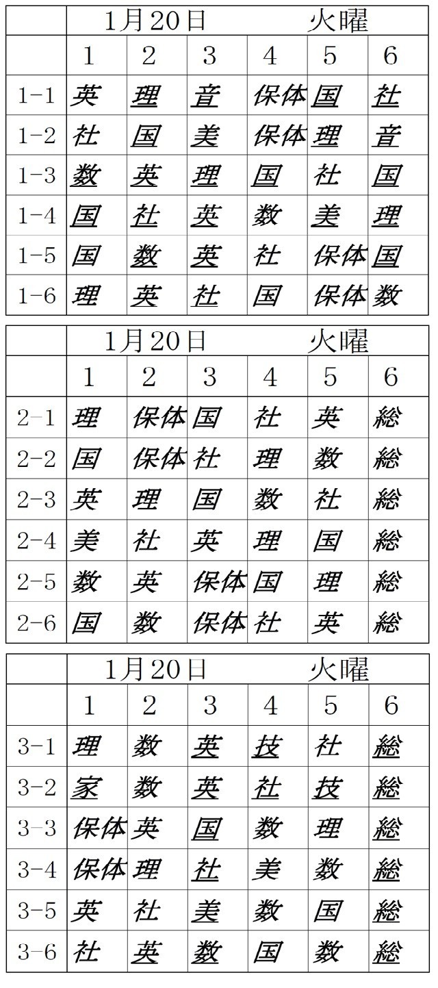 50分×6校時、給食あり、掃除なし、部活動あり、帰りの会終了15:30(3年15:40)、生徒下校完了17:00(3年16:00)です。