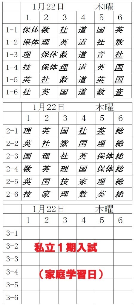 1月22日(木)【1・2年】50分×6校時、給食あり、掃除なし、部活動あり、帰りの会終了15:30、生徒下校完了17:00です。