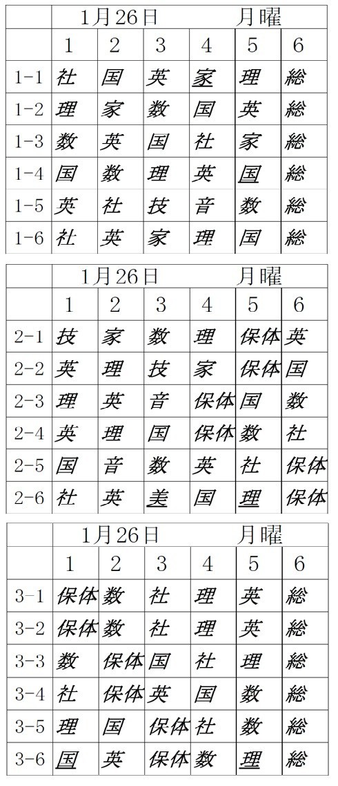 50分×6校時、給食あり、掃除あり、部活動あり、帰りの会終了15:45(3年15:55)、帰りの会終了17:00(3年16:15)です。