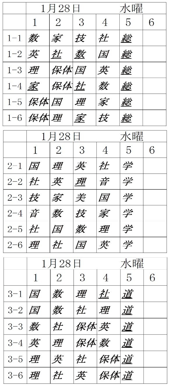 さて明日1月28日(水)の時間割です。