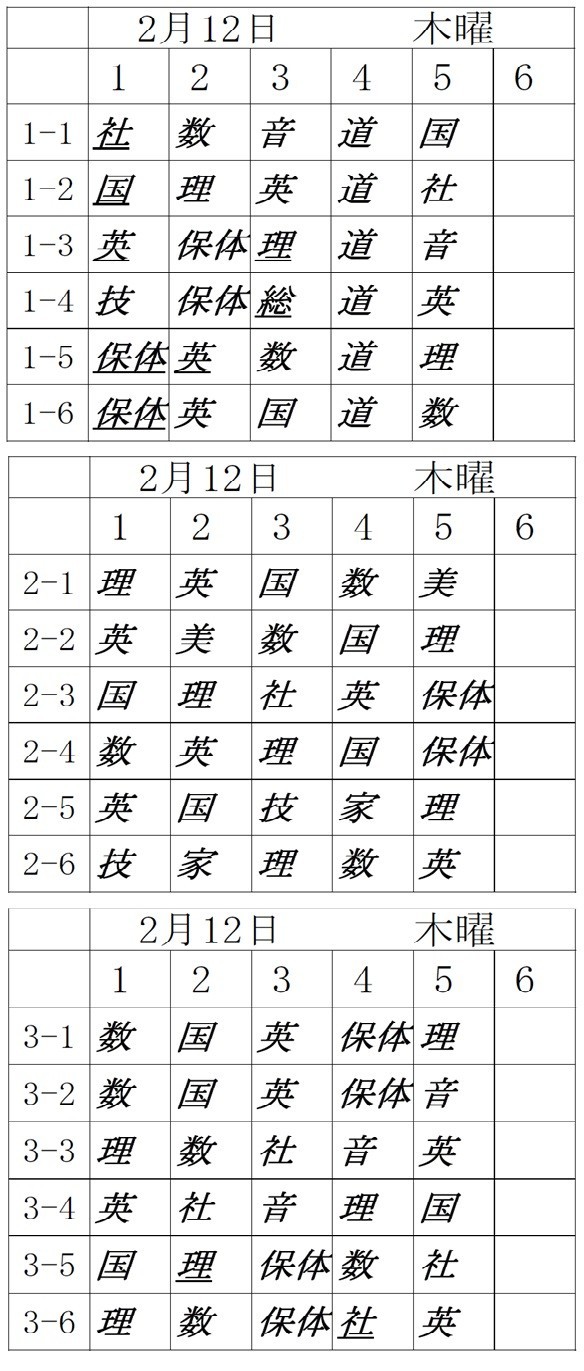 明日2月11日(水)は建国記念の日でお休みです。というわけで、明後日2月12日(木)の時間割です。